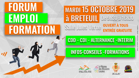 Forum de l’Emploi et de la Formation qui se déroulera le Mardi 15 octobre 2019 de 9h30 à 16h30 (sans interruption) au Centre culturel Jules Verne de Breteuil.