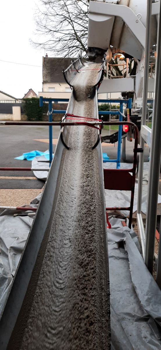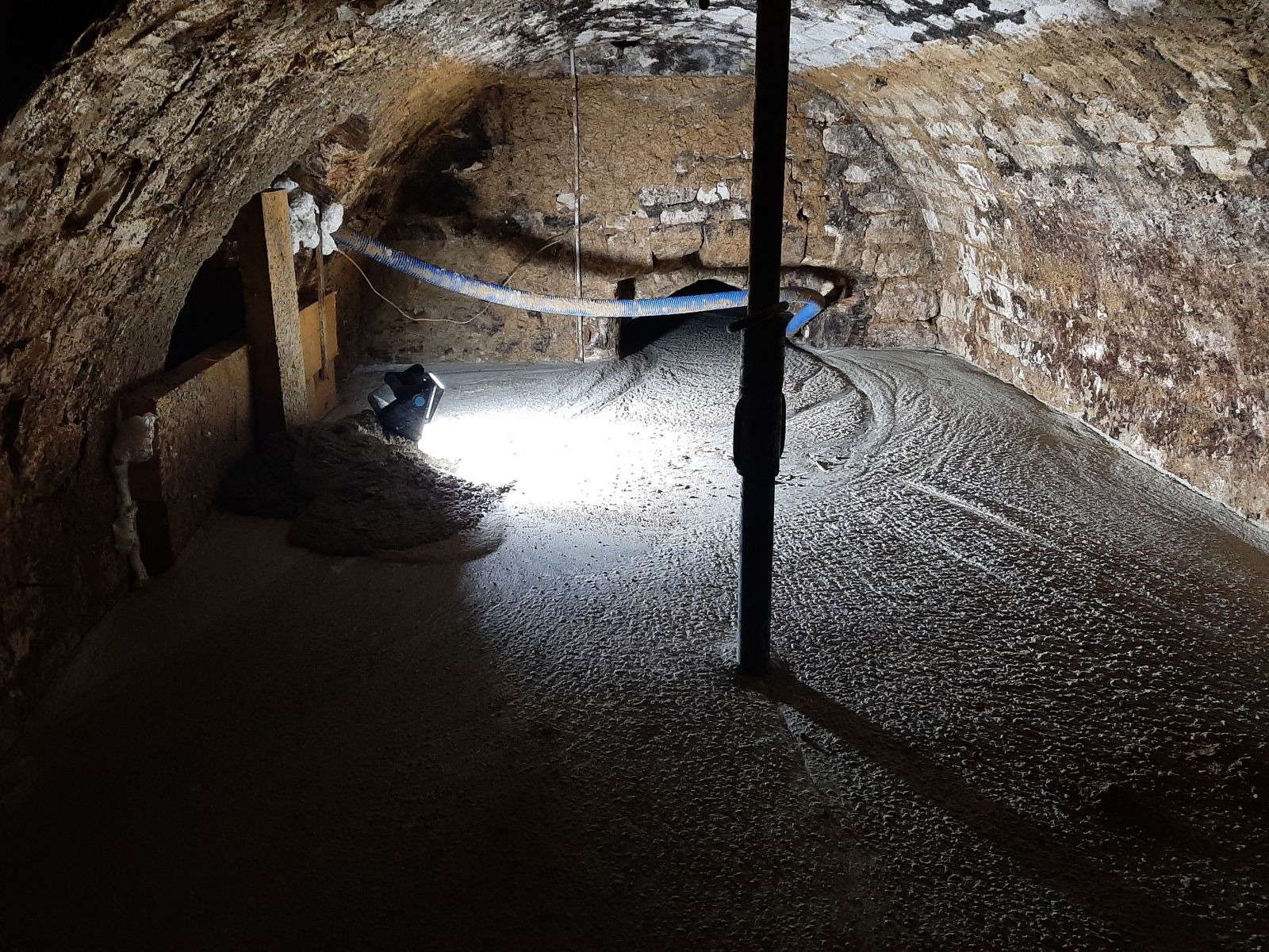 Après le comblement de la cave avec 65m3 de coulis autocompactant et l'étrésillonnage des ouvertures au-dessus de l'affaissement comme selon les prescriptions du bureau d'étude structure.
