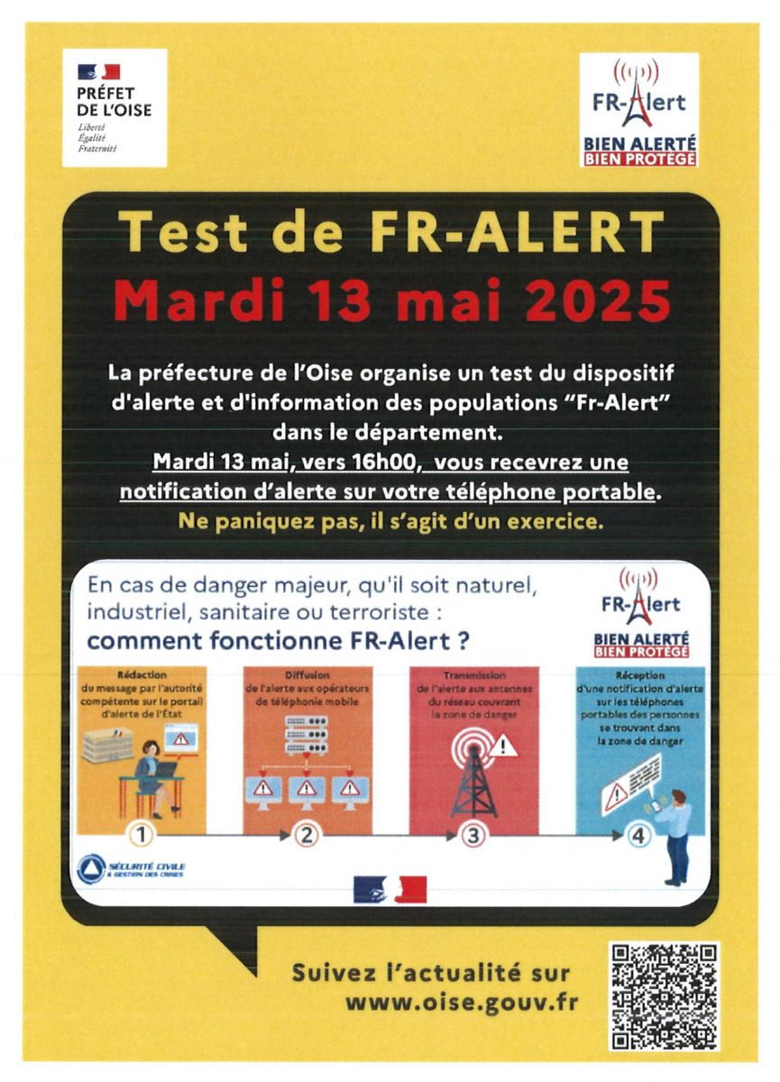 Pour vérifier le bon fonctionnement de ce dispositif, un test départemental de FR-Alert sera réalisé le mardi 13 mai prochain vers 16 heures.