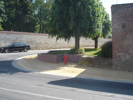 Pour l'évacuation des eaux de pluie, un caniveau a été créé sur le trottoir opposé. Le muret en brique a été prolongé laissant l'accès à la borne à incendie.