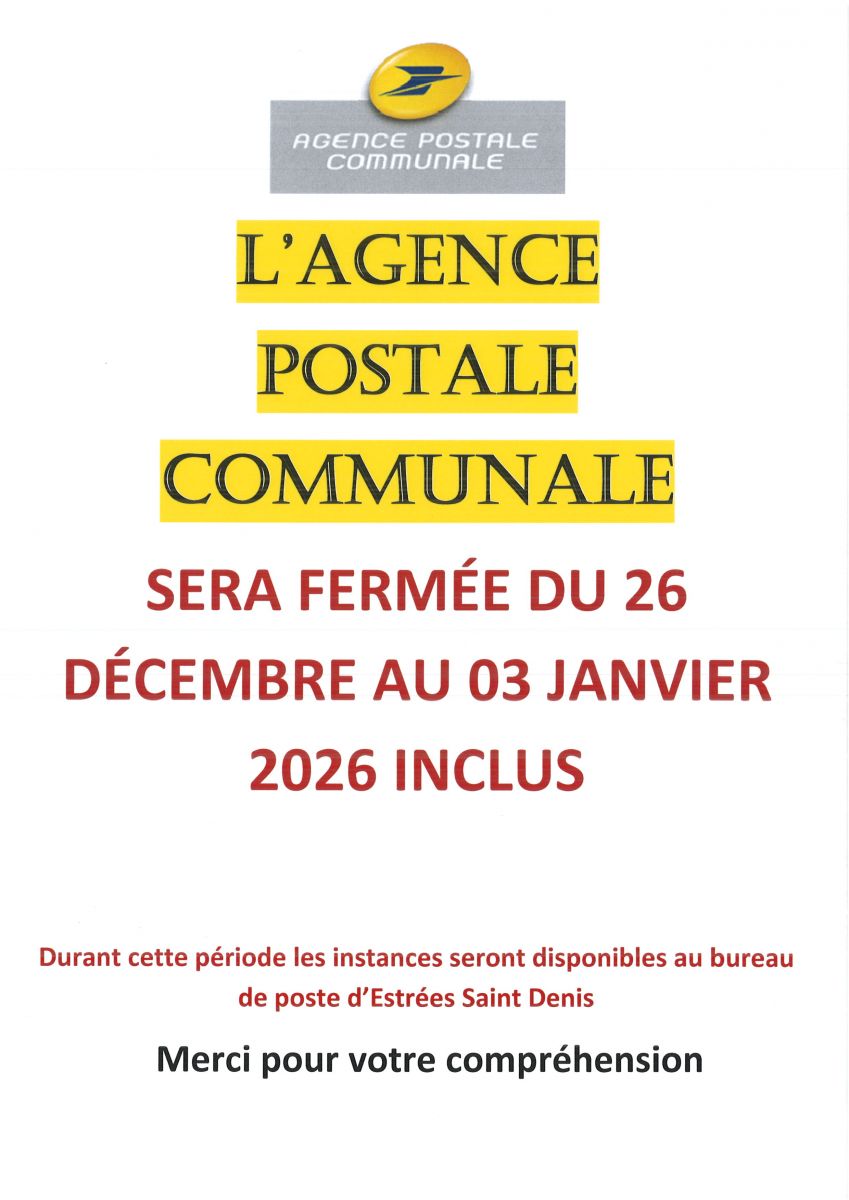 | | Fermeture de l'agence postale communale |  | Du 26 décembre au 3 janvier 2026 inclus